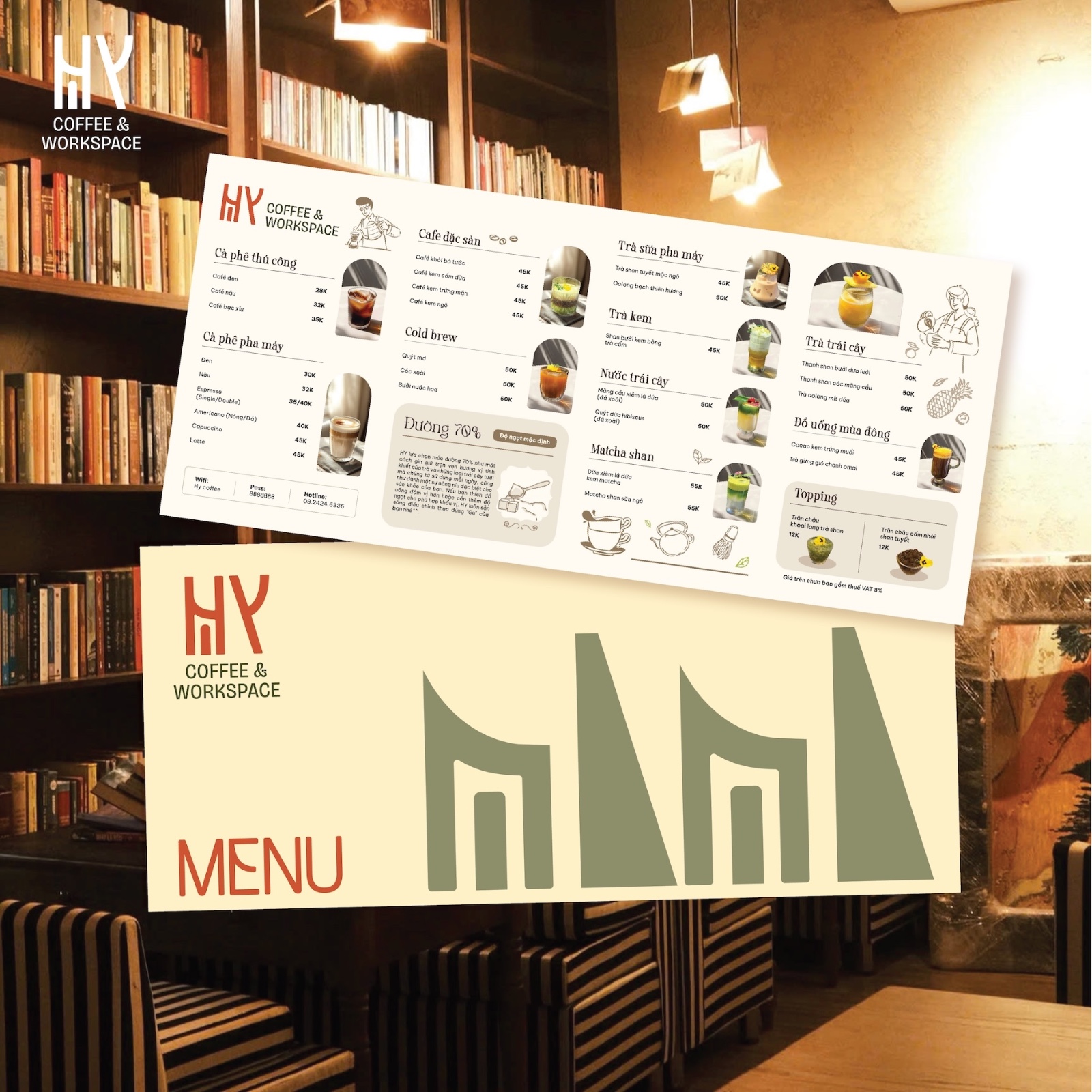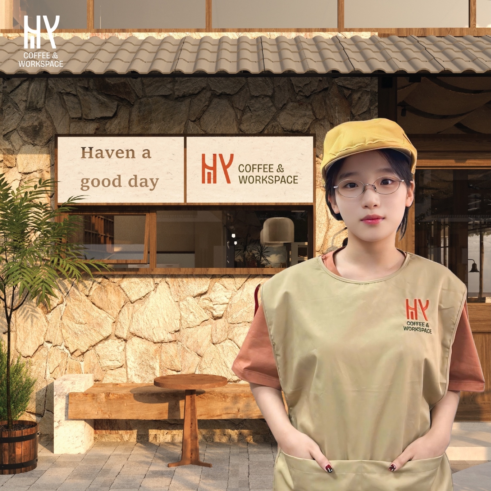 Không có chi tiết thừa, không cầu kỳ phô trương. Logo chọn cách kể câu chuyện bằng sự rõ ràng và tinh tế giống như chính Hy: nhẹ nhàng, dễ chịu nhưng có chiều sâu. Phần chữ COFFEE & WORKSPACE đặt bên dưới như một lời giới thiệu ngắn gọn mà rõ ràng: đây là nơi cà phê gặp công việc.