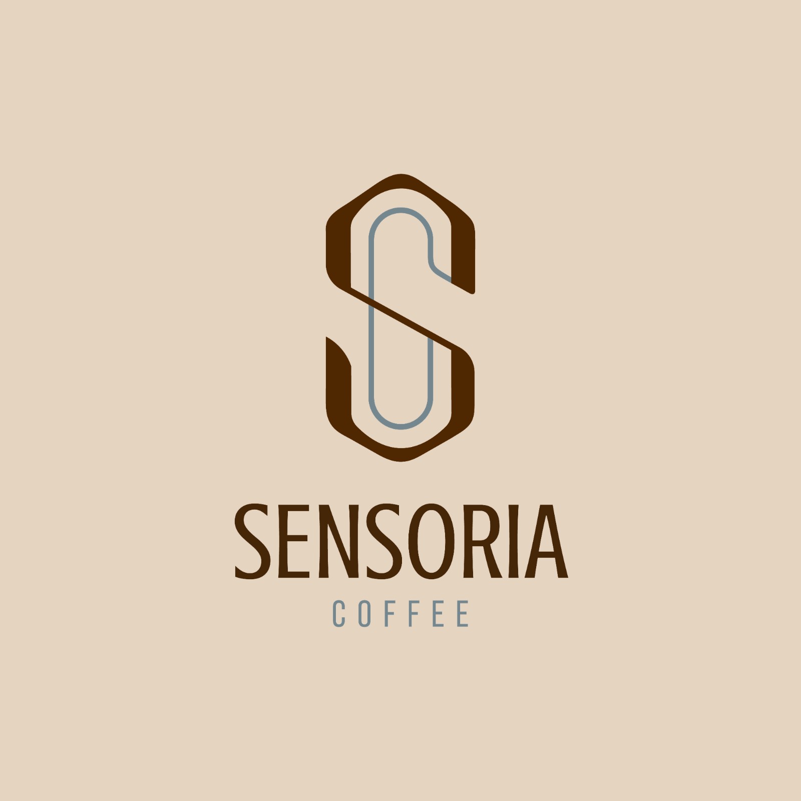 Chữ S (Sensoria) được cách điệu đầy uyển chuyển, ôm lấy lõi hình chữ C (Coffee) bên trong, tạo nên một kết cấu đối xứng hoàn hảo. Những đường bo cong mềm mại gợi liên tưởng đến làn khói hương thơm quyện chặt, trong khi hình lục giác bao quanh lại đại diện cho sự vững chãi và quy trình chế biến chuẩn mực.
